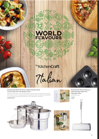 With a stockpot base, riveted side handles, a vented and toughened glass lid and two inserts; one for cooking pasta and a shallower insert for steaming vegetables. For all cooker tops including induction. 20cm diameter. Gift boxed. KCPASTAPOT