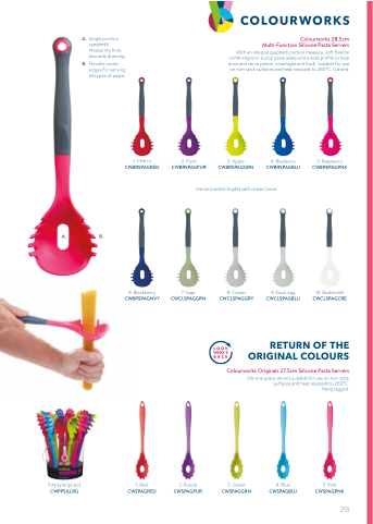 Silicone pasta servers suitable for use on non-stick surfaces and heat resistant to 260°C. Hang tagged.