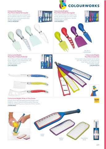 Three cheese knives and a cheese fork, all with stainless steel non-stick coated assorted coloured blades and handles. Acetate display packed. CWCLCHEESESET