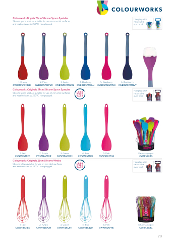 Silicone whisks suitable for use on non-stick surfaces and heat resistant to 260°C. Hang tagged.