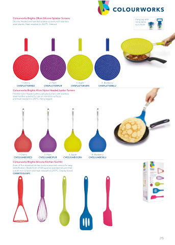 Silicone headed and handled splatter screens with stainless steel shanks. Heat resistant to 260°C. Sleeved.
