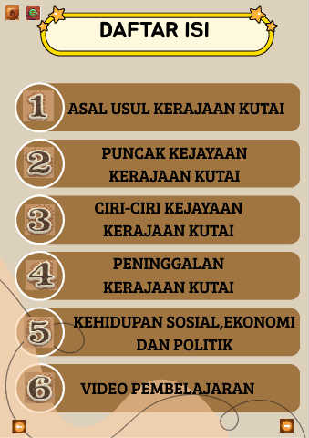 DAFTAR ISI ASAL USUL KERAJAAN KUTAI PUNCAK KEJAYAAN KERAJAAN KUTAI CIRI-CIRI KEJAYAAN KERAJAAN KUTAI PENINGGALAN KERAJAAN KUTAI KEHIDUPAN SOSIAL,EKONOMI DAN POLITIK VIDEO PEMBELAJARAN