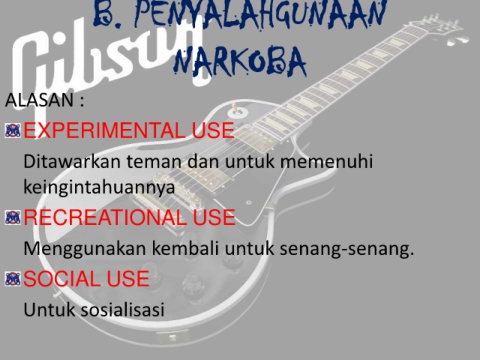 B. PENYALAHGUNAAN NARKOBA ALASAN : EXPERIMENTAL USE Ditawarkan teman dan untuk memenuhi keingintahuannya RECREATIONAL USE Menggunakan kembali untuk senang-senang. SOCIAL USE Untuk sosialisasi