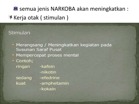 semua jenis NARKOBA akan meningkatkan : Kerja otak ( stimulan )