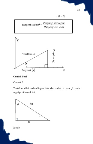 33 ... (1 – 3) Tangent sudut = Y Proyektum (r) Proyektor (y) Proyeksi x X Contoh Soal Contoh 1 Tentukan nilai perbandingan tan dari sudut dan pada segitiga di bawah ini. 50 a 40 Jawab