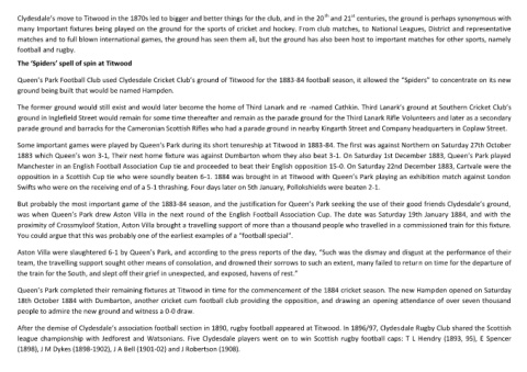 Queen’s Park Football Club used Clydesdale Cricket Club’s ground of Titwood for the 1883-84 football season, it allowed the “Spiders” to concentrate on its new