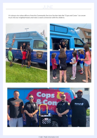 JUne It's always nice when officers from the Community Services Section take the "Cops and Cones" ice cream truck into our neighborhoods and make a sweet connection with the children. Credit: Public Information Unit