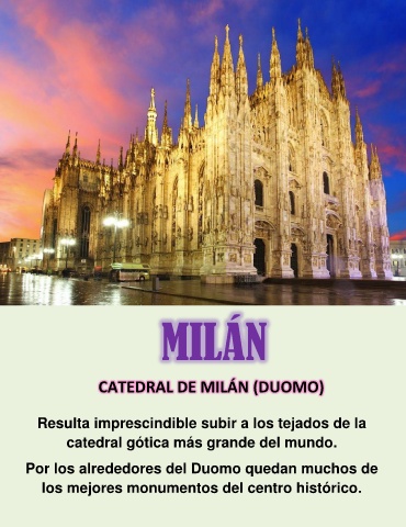 MILÁN CATEDRAL DE MILÁN (DUOMO) Resulta imprescindible subir a los tejados de la catedral gótica más grande del mundo. Por los alrededores del Duomo quedan muchos de los mejores monumentos del centro histórico.