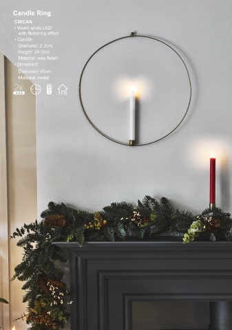 Candle Ring CWCAN • Warm white LED with flickering effect • Candle: Diameter: 2.2cm Height: 24.5cm Material: wax finish • Ornament: Diameter: 45cm Material: metal 2x