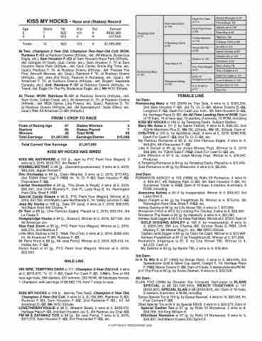 KISS MY HOCKS si 109 [c., dam by Tres Seis]. Champion 2 Year Old, Champion 2-Year-Old Colt. 9 wins to 3, $1,199,385, Rainbow D.-G1, Ruidoso F.-G1, Sam Houston F.-G2, 2nd Rainbow F.-G1., fnl. All American D.-G1. Ntr HOU 330yds.