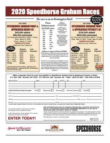 Make a separate check for each race payable to: Speedhorse Graham Paint & Appaloosa Futurity or Derby P.O. Box 1000 • Norman, OK 73070 • 617 24th Ave. SW • Norman, OK • 73069 • (405) 310-4651 • FAX (405) 310-4655