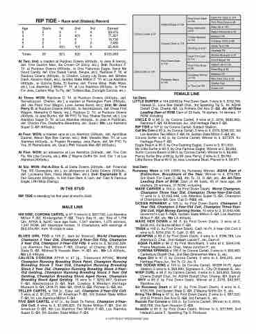OCEAN RUNAWAY si 105 (c. by First Down Dash). Champion 2 Year Old, Champion 2-Year-Old Colt, Champion Three-Year- Old Colt, High Money Earning Horse. 10 wins to 3, $1,642,498, Governor’s Cup F.-RG1, Golden State Million F.-G1, Los Alamitos Million F.-G1, etc. Ntr LA 400yds.