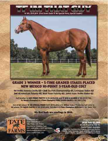 Out of G2 winner TF MS SPECIAL PERRY SI 97 ($115,284,) a $1 Million Stakes Producing half-sister to G2 winner TF CAJUN CARTEL SI 102 ($303,624). 3rd dam is 2-Time Champion DEELISH SI 102 ($604,153.)