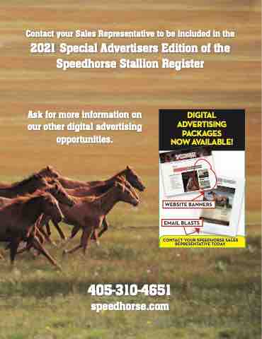 Contact your Sales Representative to be included in the 2021 Special Advertisers Edition of the Speedhorse Stallion Register