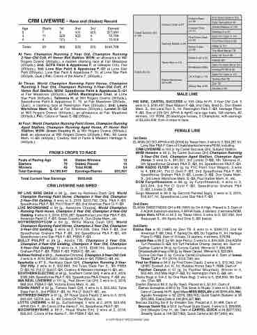 CRM LIVEWIRE si 103 (c. by Cartel Success QH). Subject Stallion. MHM Hotwire si 92 (c. by Cartel Success QH).Champion Running 3-Year-Old Colt, Champion Aged Stallion, Champion Aged Horse. 3 wins to 4, $41,931, 3rd Lorelei D-G2, 4th Talimena H., 5th Speedhorse Graham P&A D.-G1, fnl. Speedhorse P&A F.-G1. CRM RADIO FLYER si 95 (g. by PYC Paint Your Wagon). 3 wins to 4, $88,041, Pot O Gold F.-G1, 2nd Speedhorse P&A F.-G1, Speedhorse Graham P&A D.-G1, Lorelei D.-G2, Don Drake Mem.