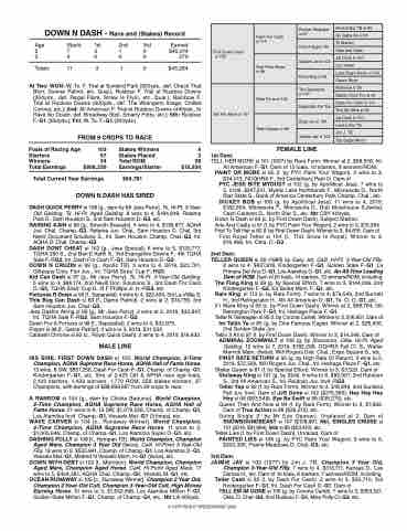 HIS SIRE, FIRST DOWN DASH si 105: World Champion, 2-Time Champion, AQHA Supreme Race Horse, AQHA Hall of Fame Horse. 13 wins, 8 SW, $857,256, Dash For Cash F.-G1, Champ. of Champ.-G1, Kindergarten F.-G1, etc. Sire of 2,425 QH & APHA race age foals, 2,103 starters, 1,439 winners, 1,770 ROM, 258 stakes winners, 37 Champions, with earnings of $88,699,687 from 29 crops to race.