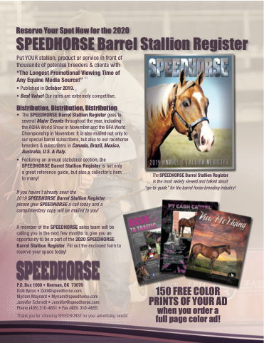2019 SPEEDHORSE Barrel Stallion Register, please give SPEEDHORSE a call today and a complimentary copy will be mailed to you!
