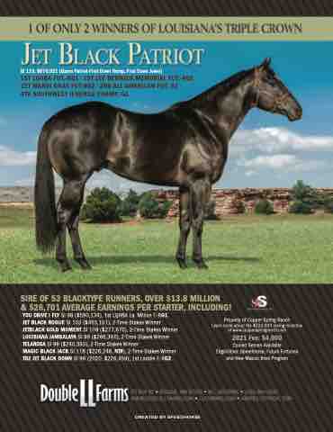 • MAGIC BLACK JACK SI 118 ($226,246, NTR), 2-Time Stakes Winner • TDZ JET BLACK DOWN SI 96 (2020, $226,459), 1st Laddie F.-RG2