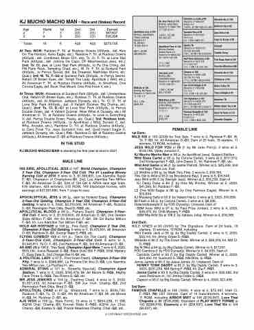 At Two: WON: Ruidoso F. Trl. at Ruidoso Downs (350yds., def. Kiss On The Horizon, Astro Eagle, etc.), Rainbow F. Trl. at Ruidoso Downs (400yds., def. Combined, Movin Dirt, etc), Tx. Cl. F. Trl. at Lone Star Park (400yds., def. Johnny De Capo, DF Mischievious Jess, etc.); 2nd: Tx. Cl. Juv. at Lone Star Park (400yds., to Pa Cha Ching, def. FM Party Rock, Tempting Chad, etc.), W. Tx. F. Trl. at Sunland Park (300yds., to Perrys Secret, def. Iba Dreamer, Mathildas Storm, etc. Qual.); 3rd: W. Tx. F.-G2 at Sunland Park (300yds., to Perrys Secret, Return Of Brown Eyes, def. Tempt The Lady, Apollitical J Wild, etc.), All American F. Trl. at Ruidoso Downs (440yds., to Amethyst, One Corona Eagle, def. Book That Mount, One Fine Hock V, etc.).