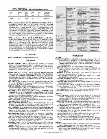 At Two: Champion 2-Year-Old Colt. WON: Ed Burke Million F.-G1 at Los Alamitos (350yds., def. J Fire Up, Chance To Fire, etc.), PCQHRA Brds.’ F.-G2 at Los Alamitos (350yds., def. Just Walk By, The Revenant, etc.), Ed Burke Million F. Trl. at Los Alamitos (350yds., def. Jess My Kiss, The Cartel Runner, etc. Qual.), PCQHRA Brds.’ F. Trl. at Los Alamitos (350yds., def. Dont Foose With Me, Magnifisant Seven, etc. Qual.), Los Alamitos Two Million F. Trl. at Los Alamitos (400yds., def. Just Walk By, King Of Appeals, etc.), Maiden at Los Alamitos (300yds., def. Beduinos Royalcorona, La Bella Corona, etc.).