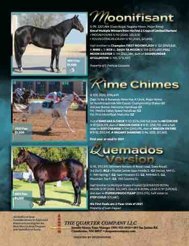 Half-brother to Multiple Stakes Finalist QUEMADOS ROYAL MOON SI 97 (2020, $32,547). Out of A ROYAL LEAD SI 97 ($29,922). 2nd dam is IFUFEELFROGGYLEAP ($102,015), half-sister to