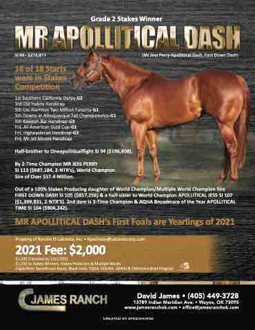 Out of a 100% Stakes Producing daughter of World Champion/Multiple World Champion Sire FIRST DOWN DASH SI 105 ($857,256) & a half-sister to World Champion APOLLITICAL JESS SI 107 ($1,399,831, 2-NTR’S). 2nd dam is 3-Time Champion & AQHA Broodmare of the Year APOLLITICAL TIME SI 104 ($904,242).
