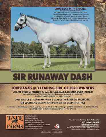 LAFITTE Qual. LQHBA Louisiana Million Fut-G1 SIR RUNAWAY CASH Qual. LQHBA Breeders’ Derby LTO THUMBS UP Qual. LQHBA Breeders’ Derby RUNAWAY FAST DASH Qual. LQHBA Louisiana Juv. Inv. RUNAWAY STARS Qual. LQHBA Louisiana Juv. Inv.
