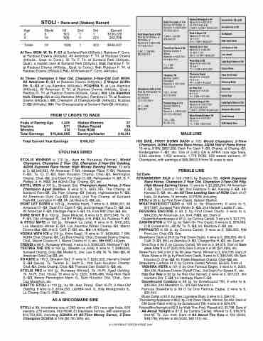 Invit. Champ.-G1, 4th Champ. of Champ.-G1, Ruidoso D.-G2, 5th The TCohtaml Cp.uarrteSnutnYlaenadr EParnk-inGg1s, fnl. All A$1m6e0r,i0ca2n7 F. Cons. Sire of 1,305 race age foals, 871 starters, 474 winners, 624 ROM, 76 blacktype horses, 2 Champions, with earnings of $16,820,685, from 17 crops to race. STOLI HAS SIRED
