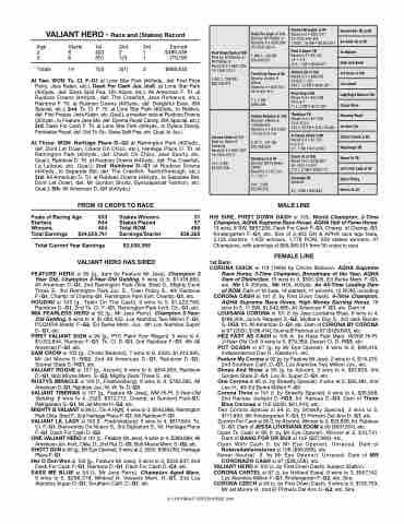 VALIANT HERO si 105 (c. by First Down Dash). Subject Stallion. CORONA CARTEL si 97 (c. by Holland Ease). 6 wins to 3, $557,142,