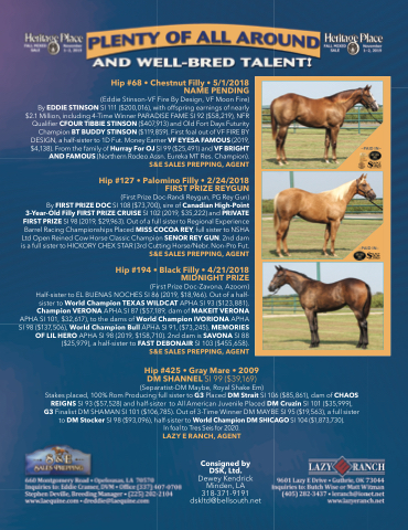 Hip #194 • Black Filly • 4/21/2018 MIDNIGHT PRIZE (First Prize Doc-Zavona, Azoom) Half-sister to EL BUENAS NOCHES SI 86 (2019, $18,966). Out of a half- sister to World Champion TEXAS WILDCAT APHA SI 93 ($123,881), Champion VERONA APHA SI 87 ($57,189, dam of MAKEIT VERONA APHA SI 101, $32,617), to the dams of World Champion IVORIONA APHA SI 98 ($137,506), World Champion Bull APHA SI 91, ($73,245), MEMORIES OF LIL HERO APHA SI 98 (2019, $158,710). 2nd dam is SAVONA SI 88 ($25,979), a half-sister to FAST DEBONAIR SI 103 ($455,658). S&E SALES PREPPING, AGENT