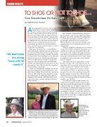Agrowing number of horses today are stay- ing barefoot as owners realize unshod feet can be healthier than having shoes on all the time. Some barefoot pleasure horses and trail horses are never shod. Some are ridden with hoof boots, but many are ridden barefoot and can with- stand the stresses that we used to think could only be handled with shoes. But what about racehorses? Their feet have to withstand a lot of stress and some owners are reluctant to run them without shoes, yet many young racehorses today are started in their first races barefoot.