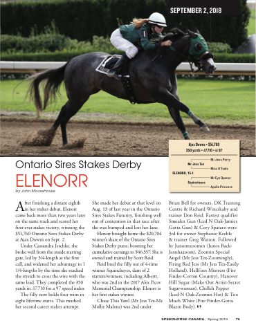 After finishing a distant eighth in her stakes debut, Elenorr came back more than two years later on the same track and scored her first-ever stakes victory, winning the $51,760 Ontario Sires Stakes Derby at Ajax Downs on Sept. 2.