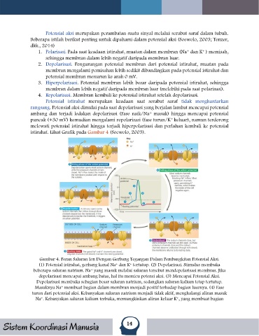 (1) Potensial istirahat, gerbang kanal Na dan K tertutup. (2) Depolarisasi. Stimulus membuka