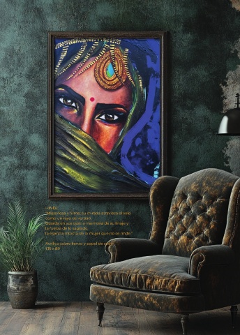 HINDI “Misteriosa y firme, su mirada atraviesa el velo como un rayo de verdad. Guarda en sus ojos la memoria de su linaje y la fuerza de lo sagrado, la esencia intacta de la mujer que no se rinde.” Acrílico sobre lienzo y papel de seda 1,16 x 89