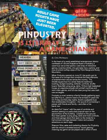 In the heart of a newly established entertainment district northwest of I-25 and Arapahoe Road is Pindustry, a cavernous venue that sports a vast array of interactive games, inventive drinks, chic-yet-tasty menu options, and one-of-a-kind rooftop views of the Front Range and Rocky Mountains.