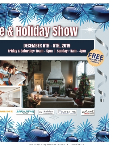 e & Holiday Show DECEMBER 6TH – 8TH, 2019 Friday & Saturday: 10am – 5pm | Sunday: 11am – 4pm FREE ADMISSION & PARKING ponsors: advertise@castlepinesconnection.com . 303-785-6520 17