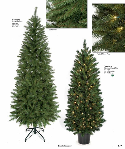 C-80270 6.5’ Balkan Pine 922 Tips 36” Width Wire Stand Balkan Pine Potted Mixed Pine C-110958 5’ Potted Mixed Pine 464 Tips 200 LED Lights 27” Width 179 Stands Included