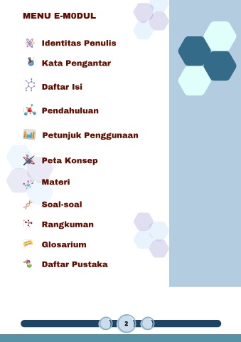 MENU E-M0DUL Identitas Penulis Kata Pengantar Daftar Isi Pendahuluan Petunjuk Penggunaan Peta Konsep Materi Soal-soal Rangkuman Glosarium Daftar Pustaka 2