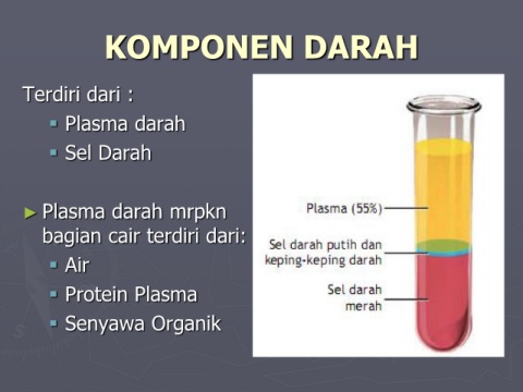 KOMPONEN DARAH Terdiri dari : ▪ Plasma darah ▪ Sel Darah ► Plasma darah mrpkn bagian cair terdiri dari: ▪ Air ▪ Protein Plasma ▪ Senyawa Organik
