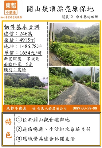 關山崁頂漂亮原保地 關農12 台東縣海端鄉 物件基本資料 總價:246萬 面積:4915㎡ 地坪:1486.78坪 單價:1654元/坪 面寬深度:不規則 面臨路寬:9米 類別:農地 東都不動產 咱 台東人的房屋公司 (089)33-58-88 特 ①位於關山觀音壇鄰地 ②道路暢通、生活排水系統良好 色 ③環境優美適合休閒生活