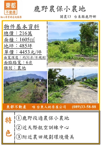 鹿野農保小農地 關農13 台東縣鹿野鄉 物件基本資料 總價:216萬 面積:1605㎡ 地坪:485坪 單價:4453元/坪 面寬深度:約31米/不規則 面臨路寬:6米 類別:農地 東都不動產 咱 台東人的房屋公司 (089)33-58-88 特 ①鹿野段適農保小農地 ②近天際航空訓練中心 色 ③附近農田規劃環境優美