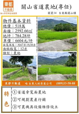 關山省道農地(專任) 關農14 台東縣關山鎮 物件基本資料 總價:518萬 面積:2592.66㎡ 地坪:784.28坪 單價:6604元/坪 面寬深度:約67米/約38米 面臨路寬:12米 類別:農地 東都不動產 咱 台東人的房屋公司 (089)33-58-88 特 ①省道旁寬面農地 ②可規劃農產行銷 色 ③可農機具設備維修設立