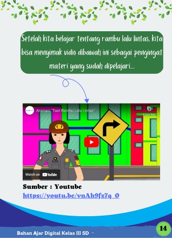 Setelah kita belajar tentang rambu lalu lintas, kita bisa menyimak vidio dibawah ini sebagai pengingat materi yang sudah dipelajari.... Sumber : Youtube https://youtu.be/vnAh9fz7q_0 14 Bahan Ajar Digital Kelas III SD