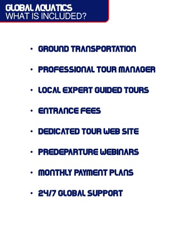 GLOBAL AQUATICS WHAT IS INCLUDED? • GROUND TRANSPORTATION • PROFESSIONAL TOUR MANAGER • LOCAL EXPERT GUIDED TOURS • ENTRANCE FEES • DEDICATED TOUR WEB SITE • PREDEPARTURE WEBINARS • MONTHLY PAYMENT PLANS • 24/7 GLOBAL SUPPORT