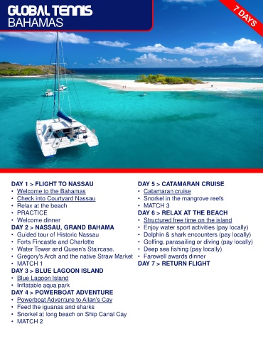 DAY 1 > FLIGHT TO NASSAU                                   DAY 5 > CATAMARAN CRUISE