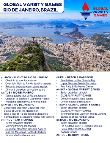 • Take a guided tour of Rio de Janeiro • GLOBAL VARSITY GAMES