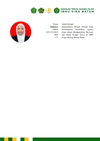 Nama Judul Skripsi Sumiaten Implementasi Metode Diskusi Pada NIRM Pembelajaran Pendidikan Agama 1207.232.0013 Islam dalam Meningkatkan Motivasi IPK dan Minat Belajar Siswa di SMP 3.57 Negeri Kijang Bintan Timur