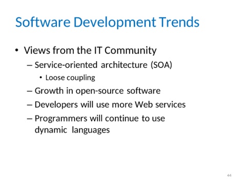 Software Development Trends • Views from the IT Community – Service-oriented architecture (SOA) • Loose coupling – Growth in open-source software – Developers will use more Web services – Programmers will continue to use dynamic languages 44
