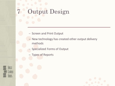 7 Output Design – Screen and Print Output – New technology has created other output delivery methods – Specialized Forms of Output – Types of Reports