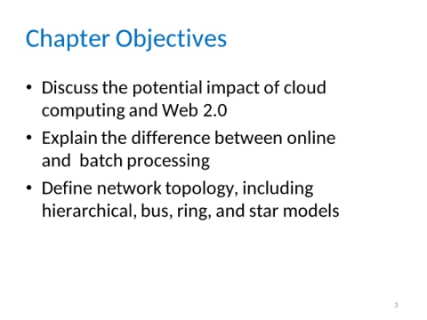 Chapter Objectives • Discuss the potential impact of cloud computing and Web 2.0 • Explain the difference between online and batch processing • Define network topology, including hierarchical, bus, ring, and star models 3